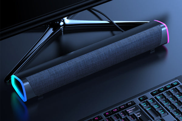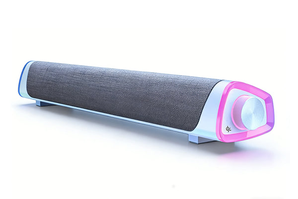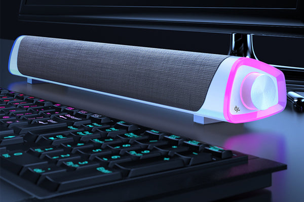Enhance your desktop setup with this slim soundbar featuring dynamic LED lights and powerful 6W stereo sound, designed to fit perfectly under most monitors.