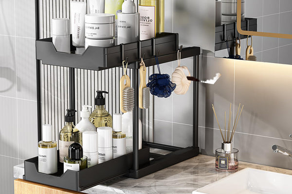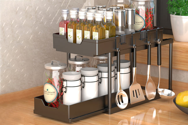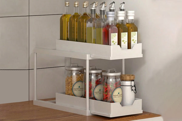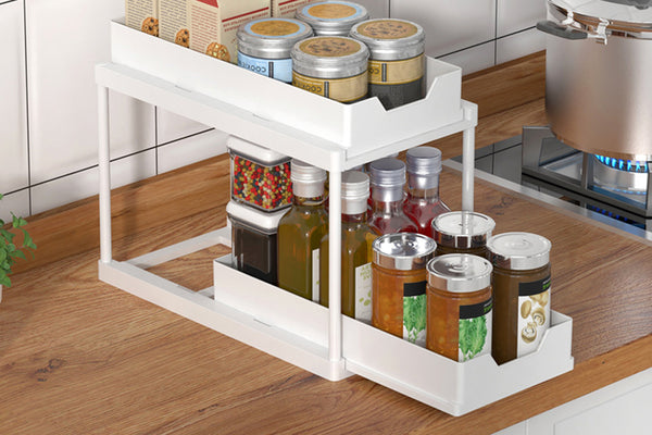 Featuring a two-tier pull-out design with slide rails, this organizer ensures easy access to both upper and lower shelves, keeping daily supplies conveniently within reach.