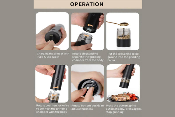 One Touch Automatic Grinding: Simple one touch operation that effortlessly grinds black pepper, Sichuan pepper, sea salt, and more.