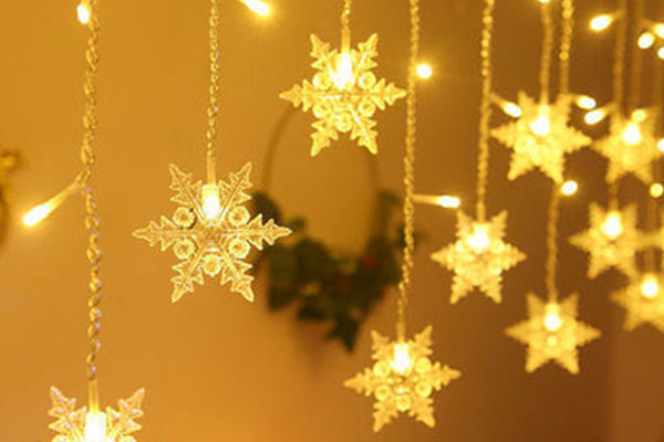 LED curtain lights featuring glowing snowflakes or Christmas trees, perfect for indoor and outdoor holiday decoration.