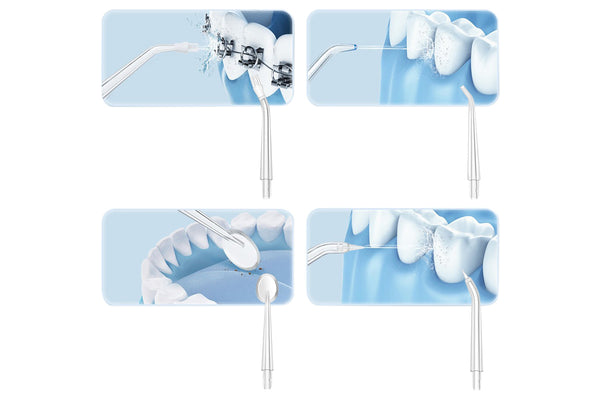 The water flosser with 0.6mm fine water stream and 360 degree rotating nozzles for precise targeting.