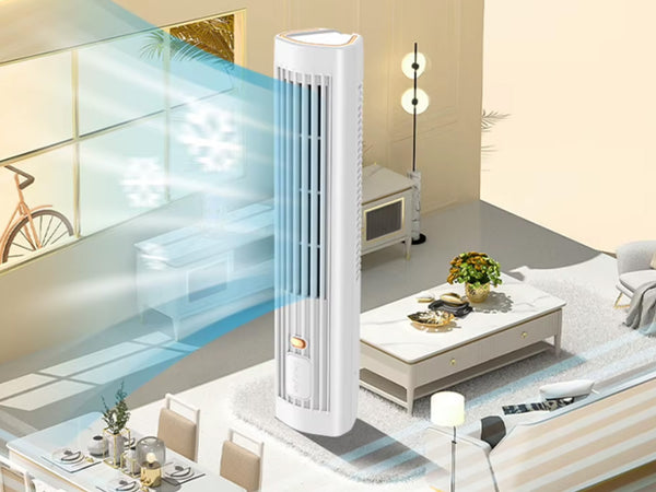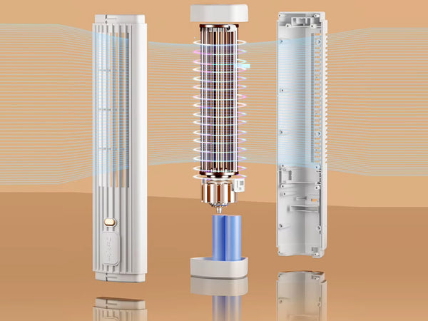 Description: Experience gentle, even airflow with this rechargeable bladeless tower fan featuring three adjustable speeds and ultra-quiet operation.